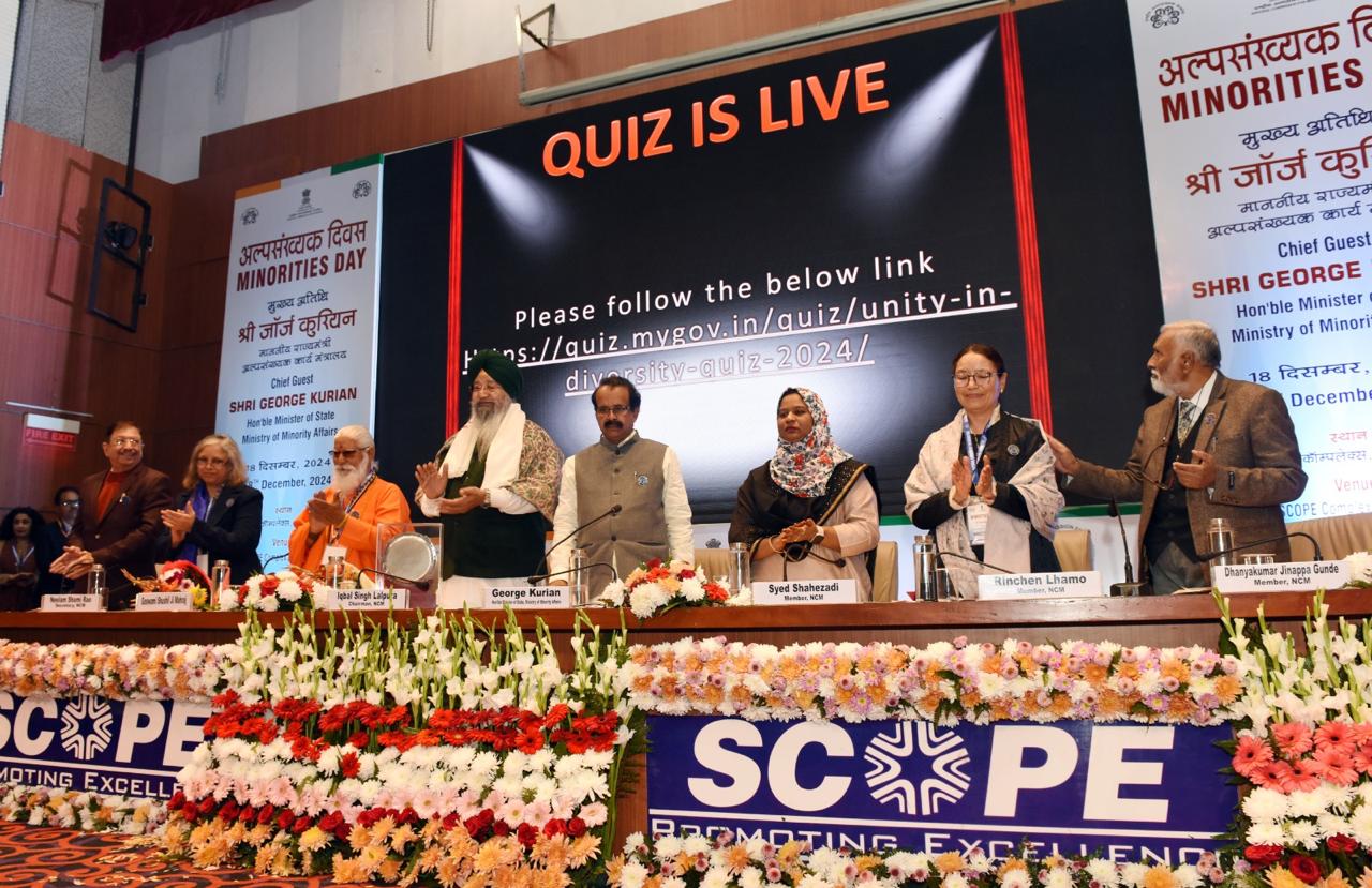 The National Commission for Minorities (NCM) celebrated Minority Rights Day on 18th December 2024. The event was graced by the Hon’ble Minister of State for Minority Affairs, Shri George Kurian, as the Chief Guest. The occasion witnessed participation from distinguished speakers representing all religious minority communities, who emphasized the significance of the day. The gathering reaffirmed their commitment to unity, communal harmony, and the NCM's motto: Samta, Suraksha, Sauhard (Equality, Security, Harmony).